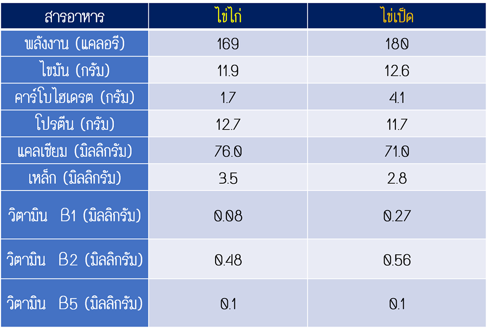 จะเห็นได้ว่าคุณค่าของไข่ไก่และไข่เป็ด มีส่วนแตกต่างกันบ้าง เช่น ไข่ไก่เหนือกว่าไข่เป็ด ในด้านโปรตีน แคลเซียม เหล็ก แต่ไข่เป็ดกลับเหนือว่าในด้านพลังงาน ไขมัน คาร์โบไฮเดรต วิตามิน B1 วิตามิน B2