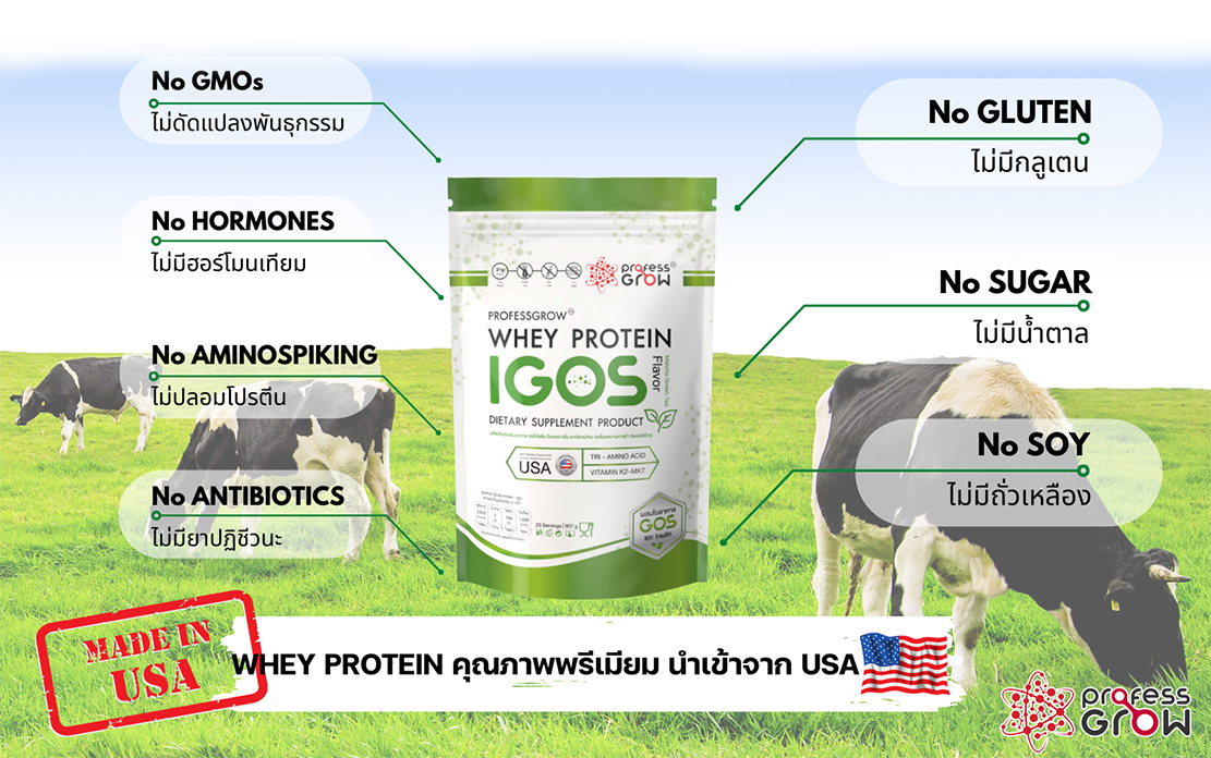 Whey Protein IGOS สกัดจากนมวัวคุณภาพสูง ไม่เจือปนสารกระตุ้น ไม่มีถั่วเหลือง ไม่มีกลูเตน ไม่มีน้ำตาล